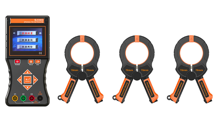 S230D 三相智能相位伏安表 是一款专为现场测试的多功能智能仪表,由 主机 、 电流钳 (3 把 ) 、 测试线 (4 条 ) 等组成。主机采用 3.5 寸真彩液晶屏,图形菜单界面显示,向量图指示,一目了然。选用大口径电流钳能测试 1000A 电流。仪表可以在被测回路不开路的情况下,同时测量三相交流电压、电流、电压间相位、电流间相位、电压电流间相位、频率、相序、有功功率、无功功率、视在功率、功率因数、电流矢量和,判别变压器接线组别、感性、容性电路,测试二次回路和母差保护系统,读出差动保护各组CT之间的相位关系,检查电度表的接线正确与否,检修线路设备等,为用电检查人员提供一种安全、准确、便捷的智能仪表。适用于电力、石油化工、冶金、铁路、气象、工矿企业、科研院校、计量部门等。尤其适用于大功率三相电机、电能计费系统及继电保护系统的电参数测试。