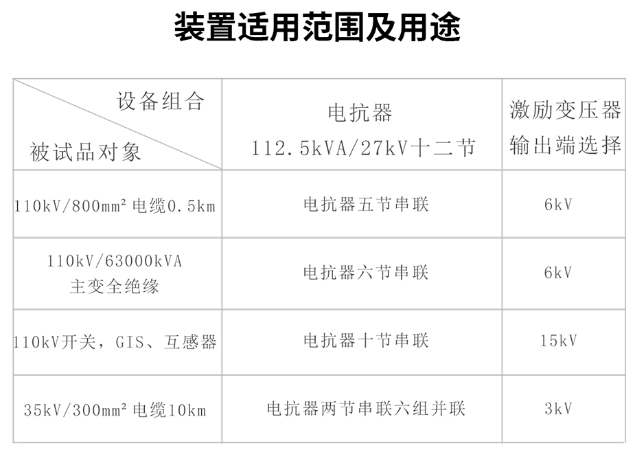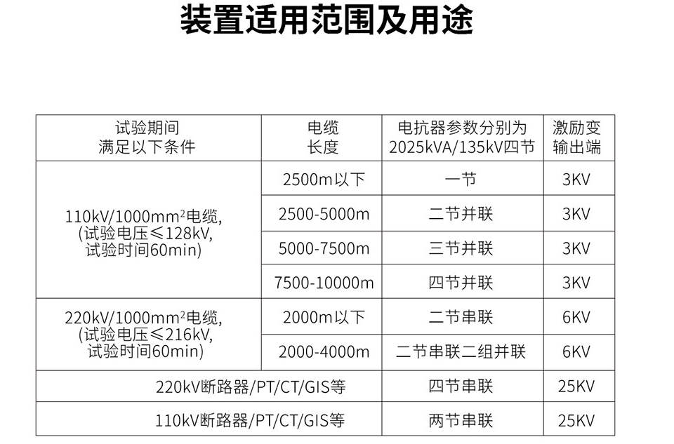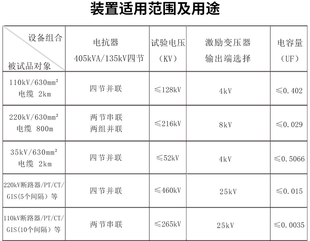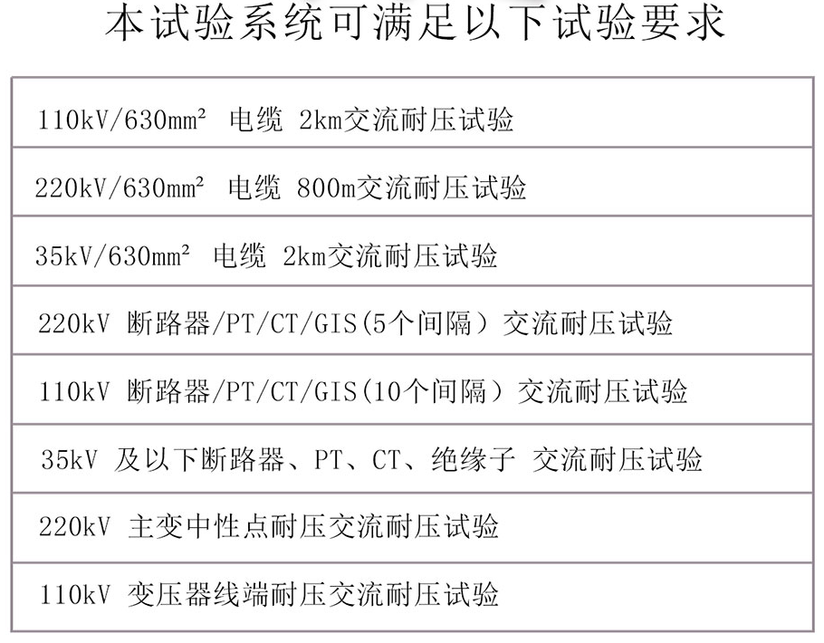 主要针对110kV/300mm²电缆0.5km,35kV/300mm²电缆2km、10kV/300mm²电缆5km、110kV/63000kVA主变中性点、110kV开关,35kV开关、GIS的交流耐压试验设计制造。具有较宽的适用范围,是地、市、县级高压试验部门及电力安装、修试工程单位理想的耐压设备。