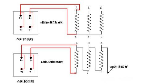 因干式变压器容量往往不大,可直接测量其绕组的直流电阻,应分相进行测量,且高压侧和低压侧分开测量。以测量A相绕组直阻为例:测量高压侧时,把A相高压侧绕组A、X两端通过专用电缆与仪器的测试接线柱连接,测试电缆的大插片连接电流端,小插片连接电压端;测量低压侧时,将cx连接断开,具体接线如下: