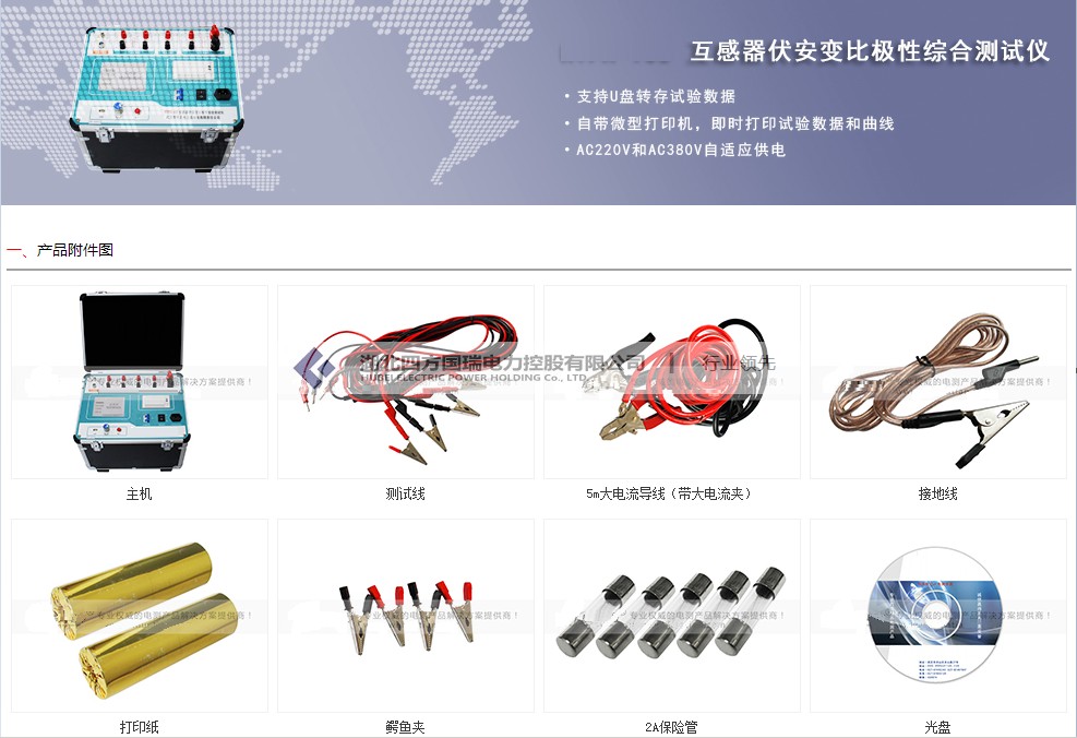 3 可选配件包括外接升压器,外接升流器,外接调压器,外接升压器最高电压可升至2000V,3A,外接升流器可升至1000A,外接调压器最大输出可达1500V,20A,采用外接升压器时,最高可做500KV等级1A电流互感器的伏安特性试验。