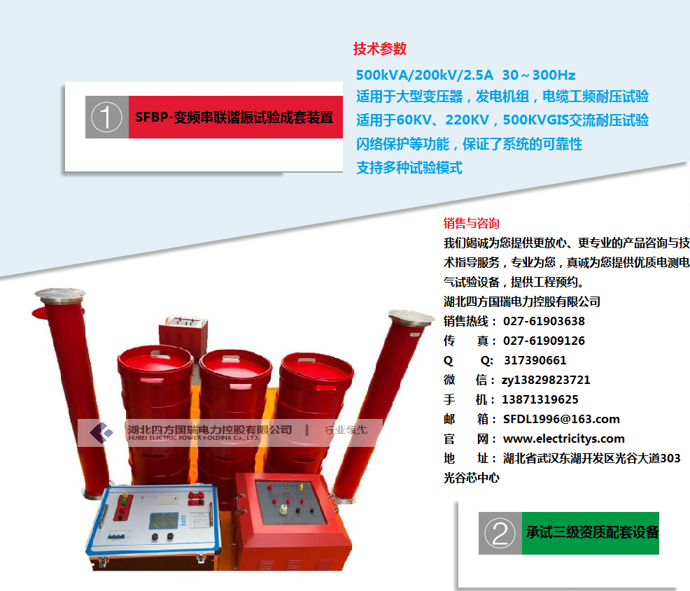 技术指标:过压、过流、零位启动、系统失谐(闪络)等保护功能。模式:全自动、手动,存入的数据,方便帮助用户识别和查找。自动扫频时频率起点可以在规定范围内任意设定,方便找到谐振点。采用了ARM平台技术,方便增减功能和升级。22kV-满足10kV电缆交流耐压试验;44kV-满足10kV开关,绝缘子,PT,CT,开关柜交流耐压试验;52kV-满足35kV电缆交流耐压试验;频率调节范围:30Hz~300Hz