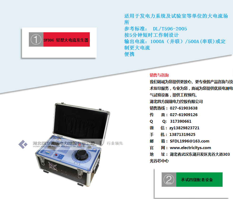技术指标:用于电力部门工程试验中电力设备与地网的连接部分的导通性检测,测量范围1~1999mΩ,测试电流DC1A、2A、5A、10A四个固定电流档位,测量精度±(0.5%+2d),测量半径50米