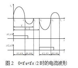 全桥串联谐振充电电源电路如图1所示。全控型开关Z1~Z4及续流二极管D1~D4组成的逆变桥与LC谐振支路构成全桥串联谐振变换器。inV为直流输入电压,负载电容通过D5~D8构成的整流桥与LC谐振支路相串联,T为升压变压器。 串联谐振变换器按开关频率fs与谐振频率fr的大小关系有三种工作方式:(1)0<f s<f r /2;(2)f r/ 2<f s<f r;(3)f s>f r。 其中,方式(1)在开关器件开通和关断时损耗都最小,被选作电容器恒流充电电源的工作方式。其工作时,一个开关周期的谐振电流波形示意图见图2。