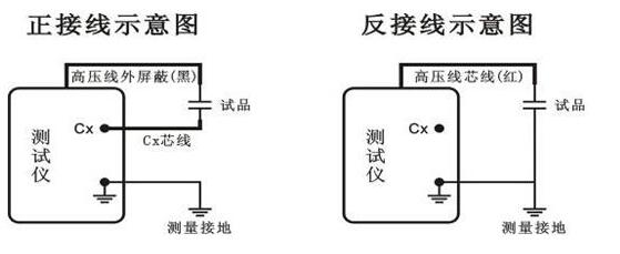 4. 小电容试品的接线 对于小电容,空气湿度较大时,其tgδ受其表面状态影响,介损测量值异常且不稳定。此时可采用屏蔽环吸收试品表面泄漏电流,其屏蔽电极在正接法时接地,反接法时接Cx的屏蔽层;此方法有可能改变被试设备内部的电场分布而影响tgδ;标准电容器和标准介损器均采用此接法。