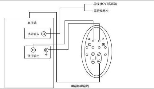 将红色专用高压电缆从仪器后侧的HVx端上引出 ,高压屏蔽线皮接被试设备高压端。