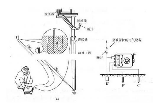 接地电阻测试使用图解:a)实际操作 b)等效原理